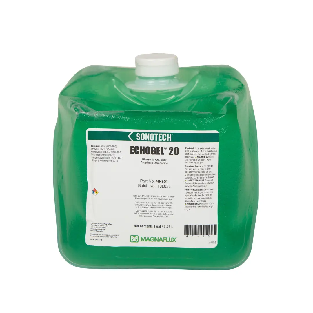Magnaflux Echogel 20 is a medium-thick, economical ultrasonic couplant gel for general flaw detection, sizing and thickness gauging on corroded, dirty or salt-caked surfaces. It spreads easily, wets rough and oily metal quickly and stays in place without running, giving stable ultrasonic readings over large areas. Formulated without silicone or glycerin and with low halogen and sulfur content, it offers good corrosion inhibition, is compatible with most metals and composites, rinses off with water after testing, and is available in multiple pack sizes for different inspection needs.