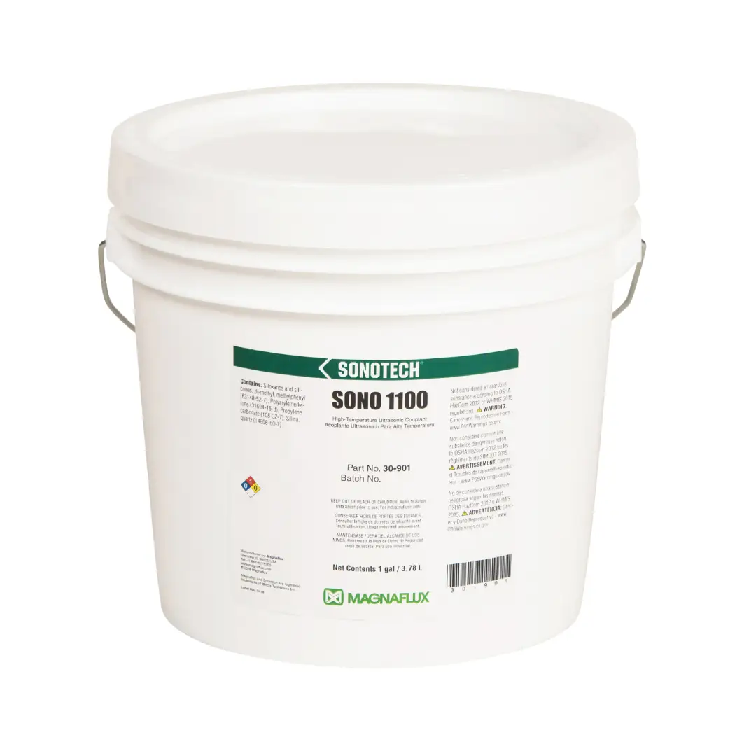 Magnaflux Sono 1100 is a high temperature ultrasonic couplant developed for thickness gauging and corrosion testing in the 700 to 775°F (371 to 413°C) range. This beige, medium-viscosity paste provides an extended open time window so inspectors can obtain stable thickness readings at high temperature, with coupling often improving until the couplant begins to thermally decompose. Sono 1100 offers excellent corrosion inhibition, is non-toxic and non-irritating, and is formulated without glycerin or propylene glycol, with low halogen and sulfur levels for compatibility with most metals used in high-temperature service.