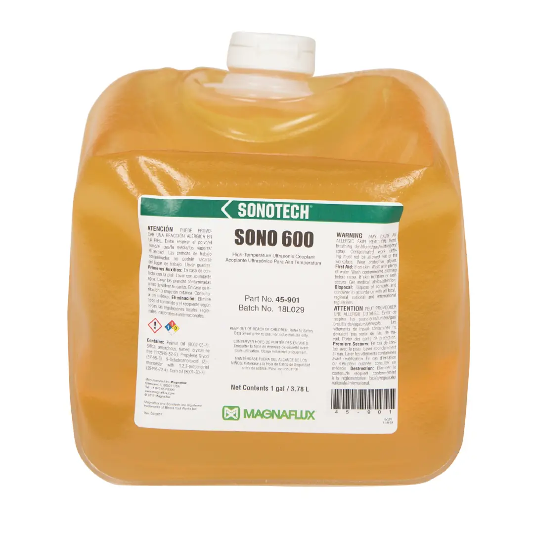 Magnaflux Sono 600 is a versatile, high-temperature ultrasonic couplant formulated as a thick, transparent amber gel for flaw detection, thickness gauging, flow metering and acoustic emission testing over a broad temperature range from 0 to 700°F (-18 to 371°C). It provides outstanding performance on a diverse range of applications, including vertical and overhead surfaces, with very slow drying time to support extended inspection time or long-term coupling. Sono 600 combines a high-temperature rating and high flash point to help minimize ignition risk and enhance inspector safety, while delivering high corrosion protection for parts. The couplant is non-toxic and biodegradable, contains no silicone or glycerin, uses propylene glycol, and maintains low halogen and sulfur levels for compatibility with most composites and metals.