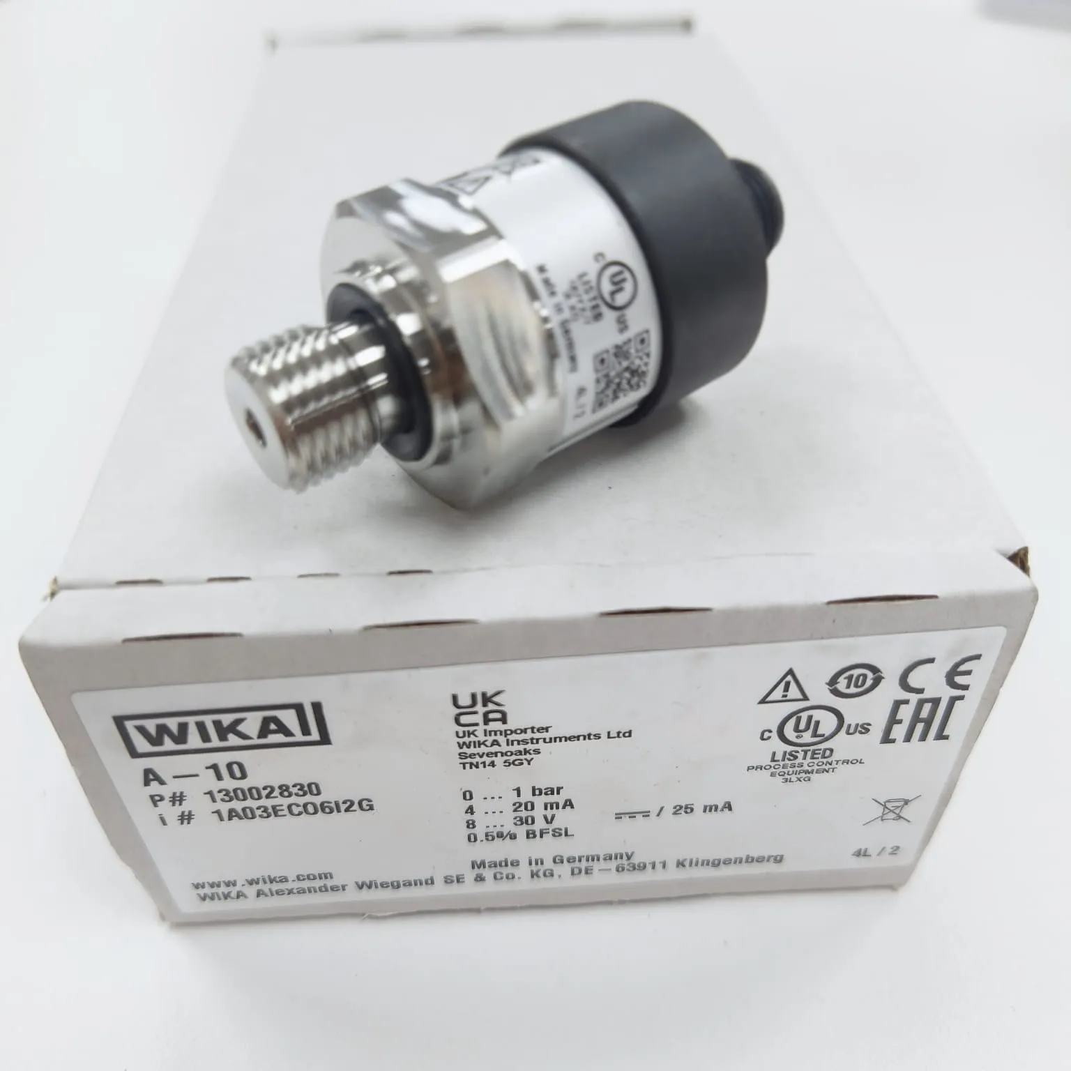 WIKA A-10 Pressure Transmitter measuring 0...1 bar gauge with G 1/4 A DIN EN ISO 1179-2 Male Connection and Circular Connector M12x1, 4-pin and converts pressure into a stable 4...20 mA, 2-wire signal for PLC/SCADA and industrial control loops. Designed as a field-proven all-rounder for general industrial applications, the A-10 is offered across many measuring ranges and configurable variants for straightforward integration into different machine and plant designs. Per WIKA data sheet PE 81.60, it uses robust stainless-steel wetted parts (316L), supports auxiliary power 8...30 V DC (option up to 8…35 V DC on request) for 4...20 mA versions, and with an M12 x 1 circular connector provides up to IP67 ingress protection when mated appropriately. Depending on the measuring range, service life is specified up to 100 million load cycles, and non-linearity is specified to ≤ ±0.5 % of span (with optional improved non-linearity), making it well-suited for machine building, measurement and control technology, hydraulics and pneumatics, pumps and compressors, and shipbuilding.