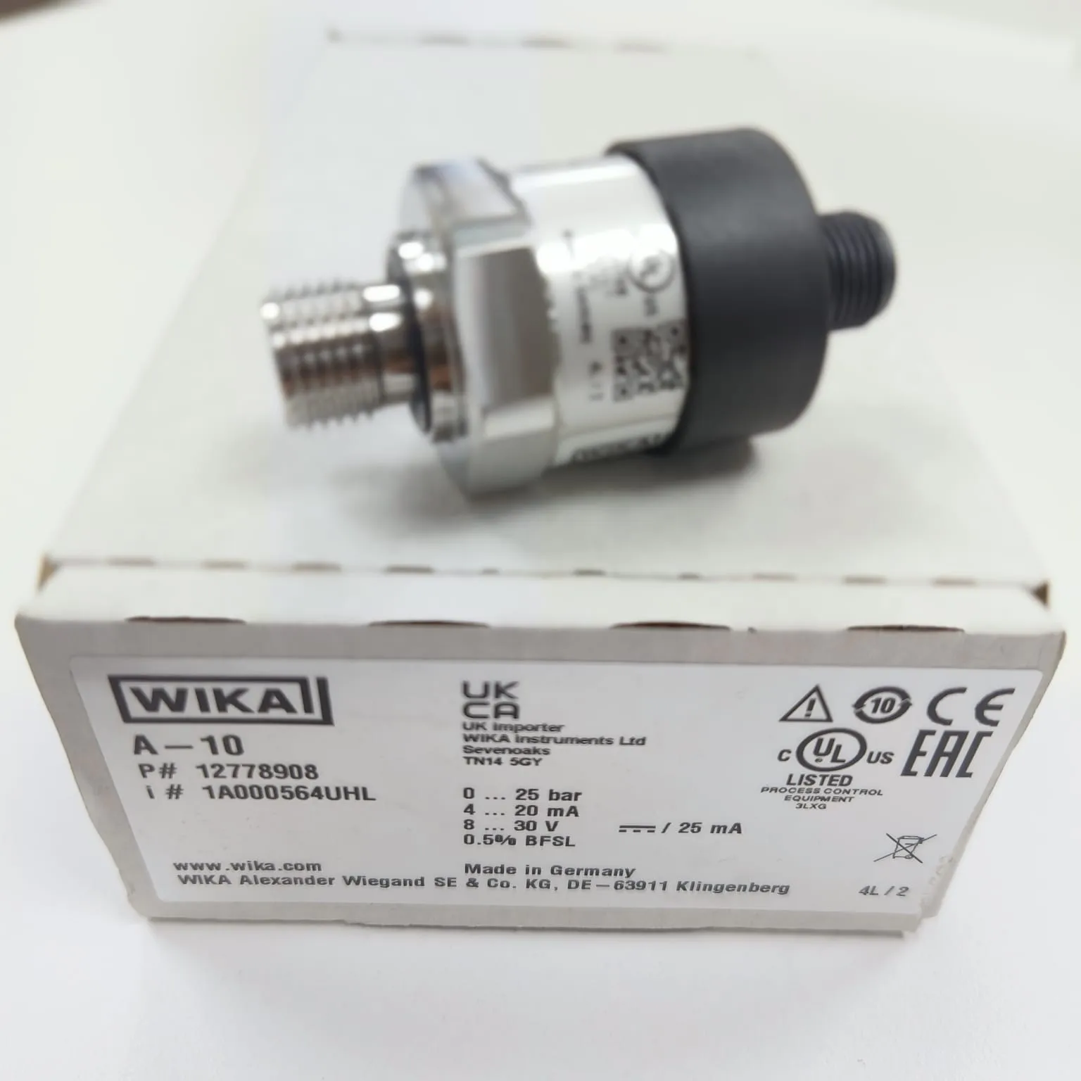 WIKA A-10 Pressure Transmitter measuring 0...25 bar gauge with G 1/4 A DIN EN ISO 1179-2 Male Connection and Circular Connector M12x1, 4-pin and converts pressure into a stable 4...20 mA, 2-wire signal for PLC/SCADA and industrial control loops. Designed as a field-proven all-rounder for general industrial applications, the A-10 is offered across many measuring ranges and configurable variants for straightforward integration into different machine and plant designs. Per WIKA data sheet PE 81.60, it uses robust stainless-steel wetted parts (316L), supports auxiliary power 8...30 V DC (option up to 8…35 V DC on request) for 4...20 mA versions, and with an M12 x 1 circular connector provides up to IP67 ingress protection when mated appropriately. Depending on the measuring range, service life is specified up to 100 million load cycles, and non-linearity is specified to ≤ ±0.5 % of span (with optional improved non-linearity), making it well-suited for machine building, measurement and control technology, hydraulics and pneumatics, pumps and compressors, and shipbuilding.