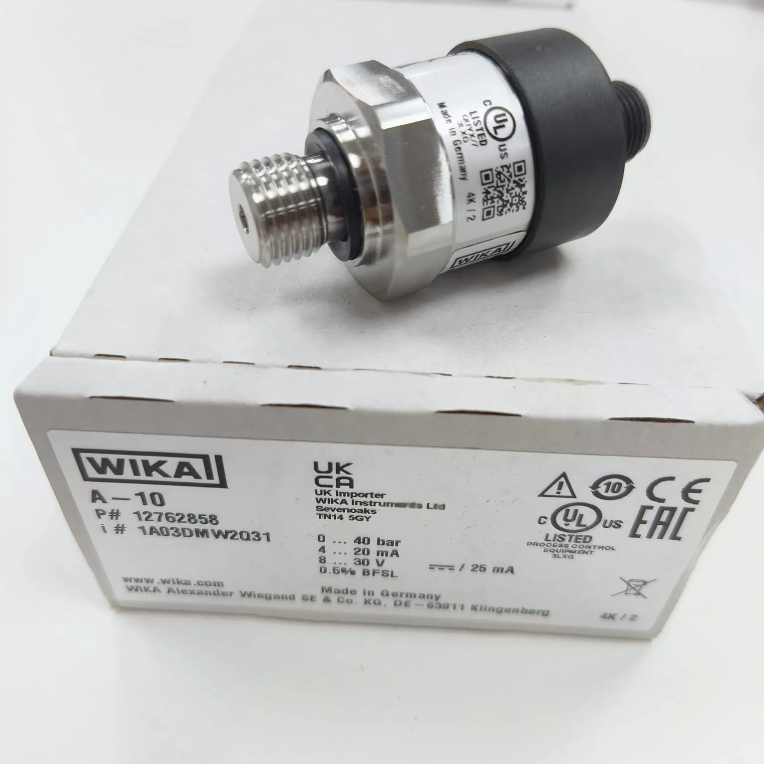 WIKA A-10 Pressure Transmitter measuring 0...40 bar gauge with G 1/4 A DIN EN ISO 1179-2 Male Connection and Circular Connector M12x1, 4-pin and converts pressure into a stable 4...20 mA, 2-wire signal for PLC/SCADA and industrial control loops. Designed as a field-proven all-rounder for general industrial applications, the A-10 is offered across many measuring ranges and configurable variants for straightforward integration into different machine and plant designs. Per WIKA data sheet PE 81.60, it uses robust stainless-steel wetted parts (316L), supports auxiliary power 8...30 V DC (option up to 8…35 V DC on request) for 4...20 mA versions, and with an M12 x 1 circular connector provides up to IP67 ingress protection when mated appropriately. Depending on the measuring range, service life is specified up to 100 million load cycles, and non-linearity is specified to ≤ ±0.5 % of span (with optional improved non-linearity), making it well-suited for machine building, measurement and control technology, hydraulics and pneumatics, pumps and compressors, and shipbuilding.