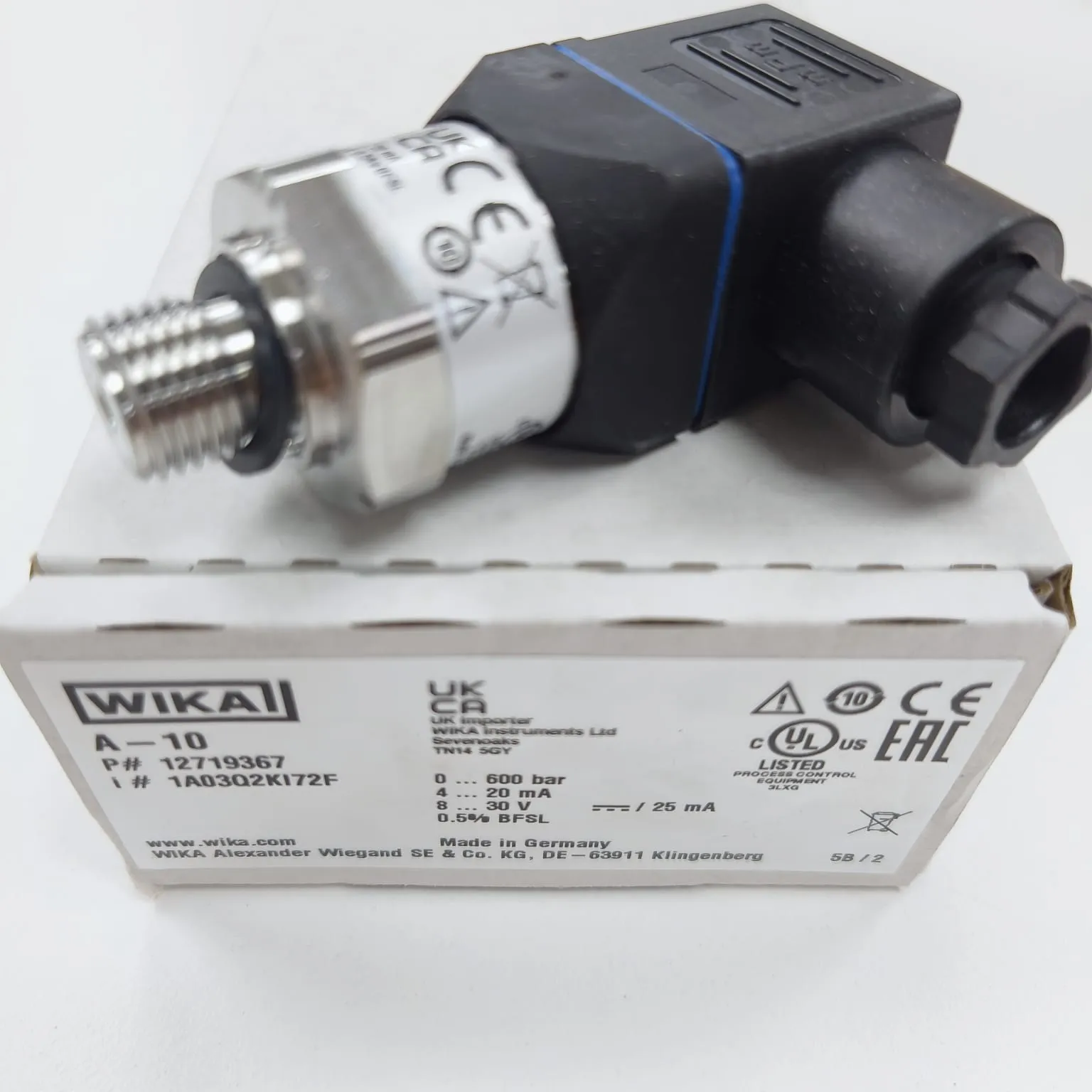 WIKA A-10 Pressure Transmitter, 0...600 Bar Gauge, G 1/4 A DIN EN ISO 1179-2 Connection, Valve Connector, Size A, 12719367