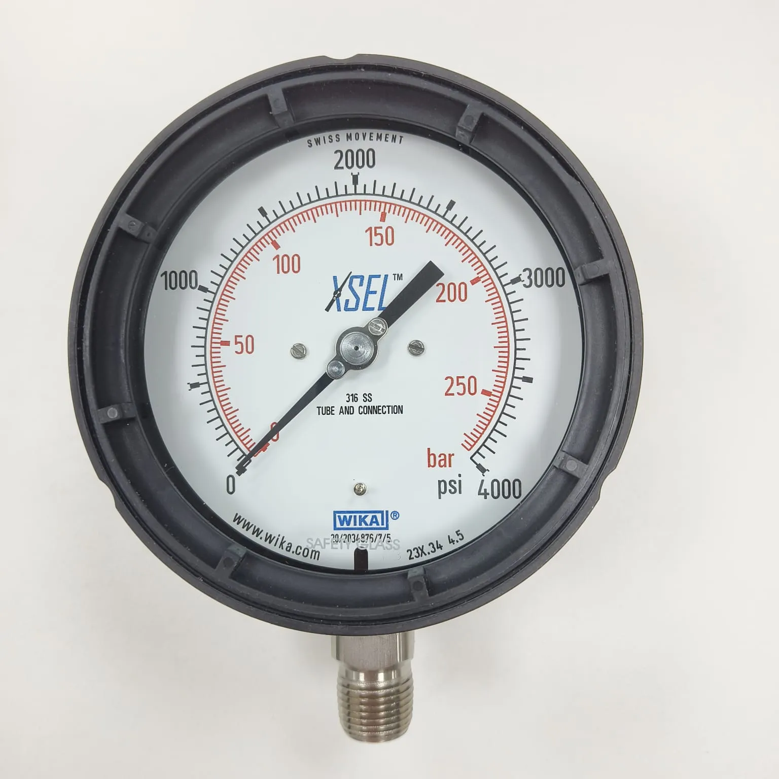 WIKA XSEL Bourdon Tube Gauge 232.34, 0...4000 psi, Dual Scale psi/bar, 4.5" Dial, 1/2" NPT Bottom Mount, 84293995